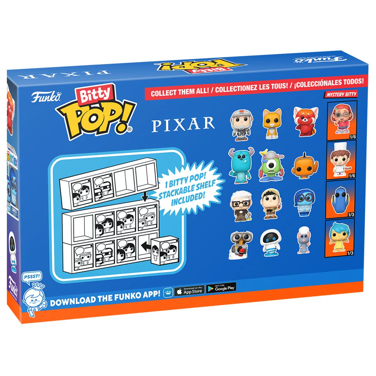 Running out of space for full-sized Funko Pop! Vinyl figures? Build a collection of your favorite Pop! Vinyl figures that take of a fraction of the space! Each Bitty Pop! Mini-Figure measures approximately 1-inch tall and comes packaged in a miniature acrylic Pop! box. The bottom lid of the Pop! box can be opened to remove the Bitty Pop!, but the figure is attached to the bottom lid. Each Bitty Pop! 4-Pack includes 4 Bitty Pop!s in individual acrylic Pop! boxes, with the set of 4 lined up horizontally together in a long acrylic case. 3 characters are visible, while one is a mystery and could be any one of 4 possible chase figures with varying rarities!
